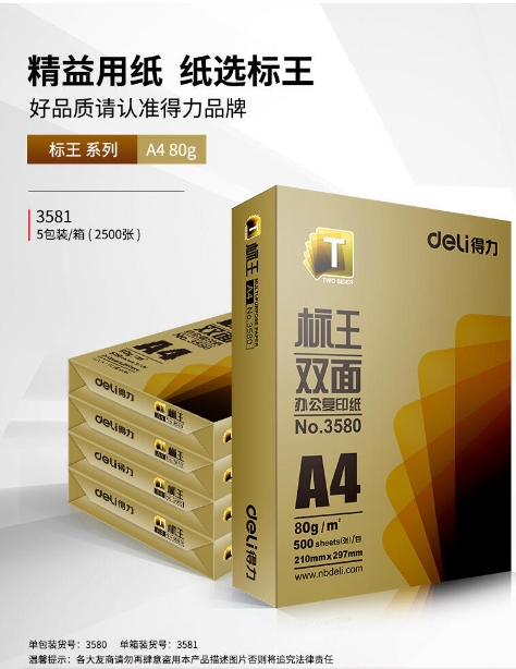得力3581标王双面复印纸(A4-80g-5包) 自营