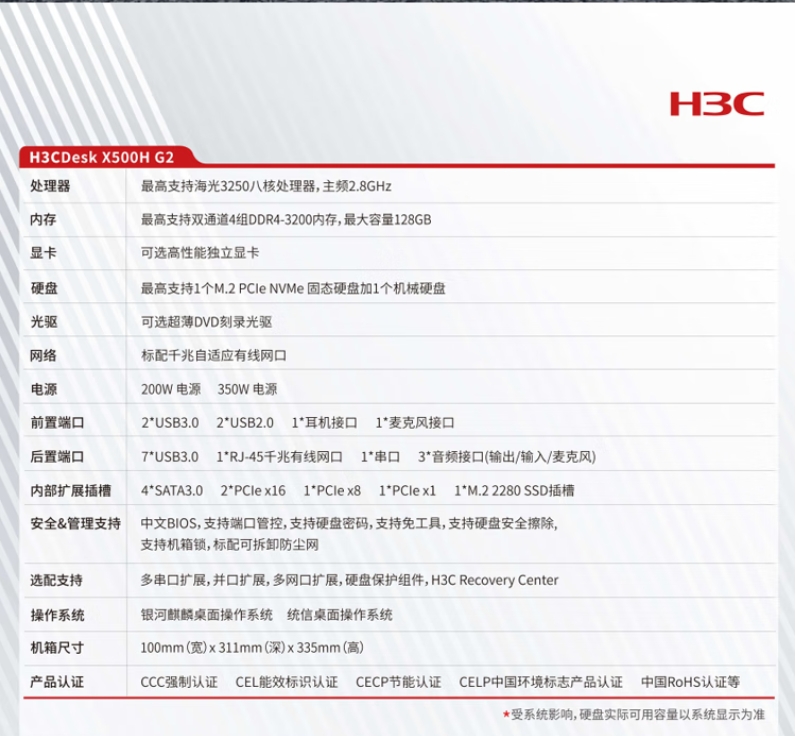 新华三/H3C Desk X500H G2 台式计算机 海光3350/16GB/512G/2G独显/23.8寸
